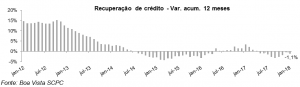 O indicador de recuperação de crédito – obtido a partir da quantidade de exclusões dos registros de inadimplentes da base da Boa Vista SCPC – apontou crescimento em janeiro de 0,3%, na comparação mensal com ajuste sazonal. Já na análise acumulada em 12 meses, houve queda de 1,1% (fevereiro de 2017 até janeiro de 2018 frente aos 12 meses antecedentes). Na comparação com o mesmo mês de 2017 a alta foi de 4,2%.