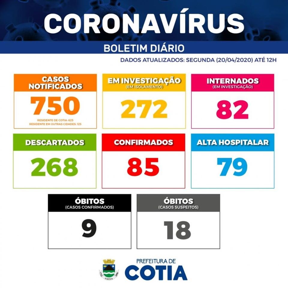 O município de Cotia contabiliza 750 notificações de casos suspeitos de infecção pelo novo Coronavírus (sendo 125 de moradores de outros municípios), 85 casos confirmados, 268 descartados, 272 seguem em investigação. Há 82 pacientes internados em investigação, 79 pacientes tiveram alta hospitalar, 18 óbitos suspeitos em investigação, 9 óbitos confirmados por Covid-19: Mulher (46 anos), Mulher (62 anos), Homem (40 anos), Mulher (60 anos), Homem (60 anos), Homem (50 anos), 2 Homens (65 anos), Homem (46 anos)