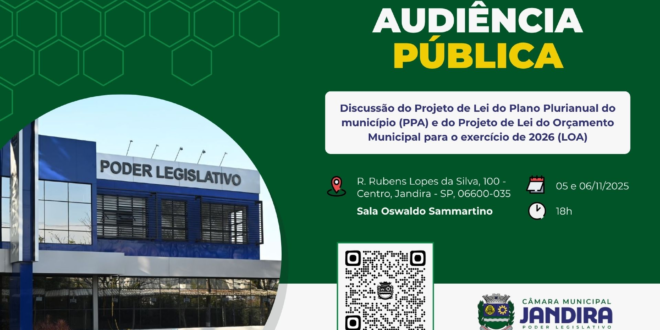 Nos dias 05 e 06 de novembro de 2025, às 18h, a Câmara Municipal de Jandira realiza nova Audiência Pública, a fim de discutir o Projeto de Lei do Plano Plurianual do município (PPA) e o Projeto de Lei do Orçamento Municipal para o exercício de 2026 (LOA).