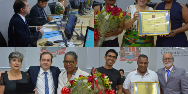 A senhora Rosemeire Cristina Martins Costa recebeu a Medalha do Mérito “José Cabinda” das mãos do Vereador Alexandre Pierroni. Foram concedidas placas-homenagem a senhora Maristela de Oliveira, congratulada pela Vereadora Dra. Cláudia Pedroso, e ao senhor Aguinaldo da Silva, indicado pelos Vereadores Toninho Barba e Toco.
