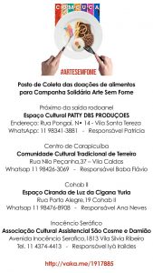 Para ajudar, a comunidade pode doar alimentos e/ou cestas básicas nos pontos de coleta voluntários, comandados por Pai Flávio, Patrícia Souza e Mãe Iraildes, ou contribuir com qualquer quantia por meio da VAKINHA online (https://www.vakinha.com.br/vaquinha/arte-sem-fome).