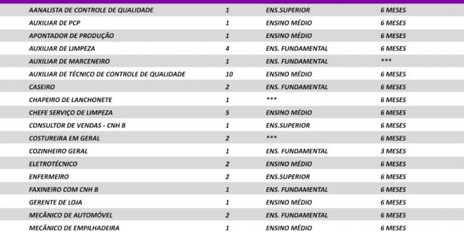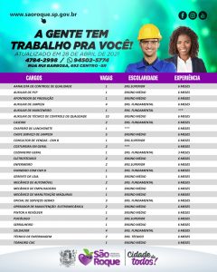 A Prefeitura de São Roque disponibiliza, nesta quarta-feira, dia 28 de abril, as vagas de emprego cadastradas no Posto de Atendimento ao Trabalhador (Pat) Municipal.