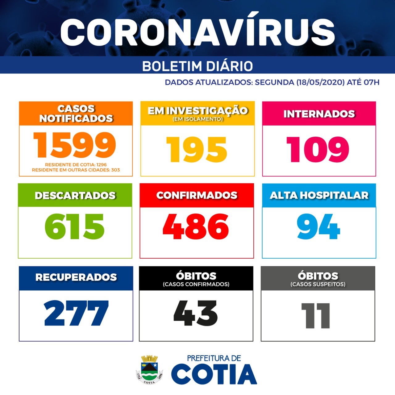 O município de Cotia contabiliza 1.599 notificações de casos suspeitos de infecção pelo novo Coronavírus (sendo 303 de moradores de outros municípios), 486 casos confirmados, 615 descartados, 195 seguem em investigação, 277 pacientes recuperados, 109 pacientes internados (suspeitos e confirmados), 94 altas hospitalares (suspeitos e confirmados), 11 óbitos suspeitos em investigação, 43 óbitos confirmados por Covid-19: Mulher (46 anos), Mulher (62 anos), Homem (40 anos), Mulher (60 anos), Homem (60 anos), Homem (50 anos), Homem (65 anos), Homem (46 anos), Homem (43 anos), Mulher (75 anos), Homem (65 anos), Homem (76 anos), Homem (46 anos), Mulher (84 anos), Homem (47 anos), Mulher (77 anos), Homem (62 anos), Homem (88 anos), Homem (82 anos), Homem (54 anos), Mulher (48 anos), Mulher (79 anos), Mulher (67 anos), Homem (64 anos), Homem (55 anos), Homem (46 anos), Mulher (32 anos), Mulher (67 anos), Mulher (41 anos), Homem (41 anos), Homem (67 anos), Homem (88 anos), Mulher (68 anos), Mulher (69 anos), Homem (29 anos), Homem (75 anos), Homem (62 anos), Homem (62 anos), Homem (72 anos), Homem (60 anos), Homem (54 anos), Mulher (54 anos), Homem (61 anos).