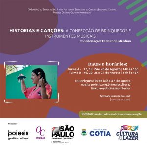 A partir dessa terça-feira (20/07) estarão abertas as inscrições para diversas oficinas gratuitas oferecidas por meio de uma parceria com a Poiesis Organização Social de Cultural, Secretaria de Cultura e Economia Criativa, com o apoio da Secretaria de Cultura e Lazer de Cotia. As aulas serão remotas, via plataforma Zoom. Entre as oficinas estão: Oficina de Pinhole, Reencontro para o Letramento Racial Crítico, A Pretação de Contas e o Projeto Proac Lab e Editais, Mediação Virtual: Ferramentas para Expandir as Fronteiras da Arte, Yaser e um lugar chamado Palestina, Workshop de Colagem, entre outros.