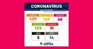 O município de Cotia contabiliza 429 notificações de casos suspeitos de infecção pelo novo Coronavírus (sendo 76 de moradores de outros municípios), 31 casos confirmados, 123 descartados, 199 seguem em investigação. Há 46 pacientes internados em investigação, 14 óbitos suspeitos em investigação e 3 óbitos confirmados por Covid-19 (duas mulheres: …