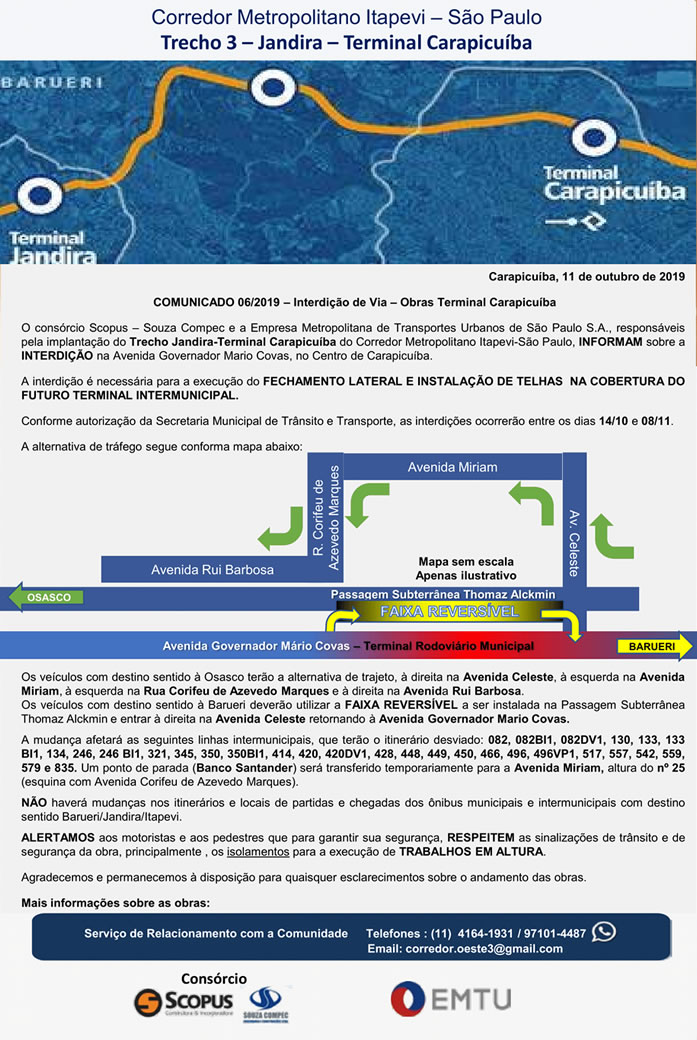 A partir da próxima segunda-feira (14) ocorrerá a interdição de mais um trecho da Avenida Governador Mário Covas, em Carapicuíba, para obras do trecho Jandira – Carapicuíba do Corredor Itapevi – São Paulo (Vila Yara). O novo bloqueio, no sentido Osasco – Barueri, será realizado para o fechamento da parede lateral e instalação de telhas na cobertura do futuro Terminal Metropolitano (segue folheto explicativo anexo) e permanecerá até 08/11.