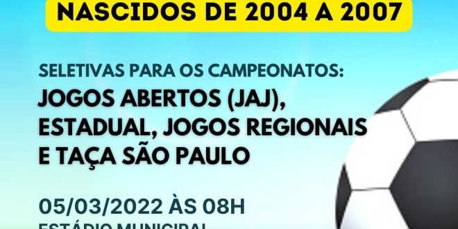 A Secretaria de Esportes e da Juventude de Cotia realiza a 1ª peneira de 2022 do futebol masculino no dia 5 de março (sábado), às 8h. Poderão participar jovens nascidos entre os anos de 2004 e 2007. Os selecionados terão a oportunidade de representar Cotia nos Jogos Abertos (JAJ), Estadual, Jogos Regionais e Taça São Paulo. A peneira será no Estádio Municipal Euclides de Almeida.