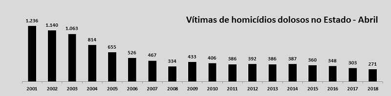Com as reduções, as taxas de homicídios do Estado diminuíram nos últimos 12 meses (de maio de 2017 a abril de 2018): foram 7,16 casos e 7,58 vítimas a cada 100 mil habitantes, os índices mais baixos para a série histórica dos dados de criminalidade, que começa em 2001.