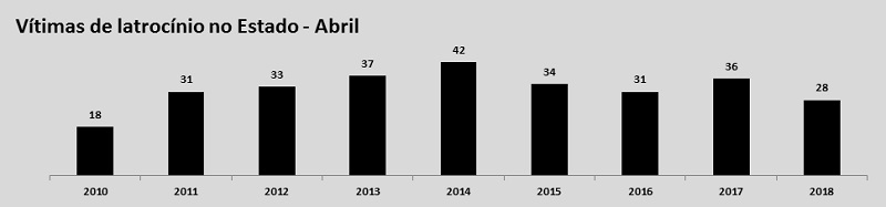 Os latrocínios caíram 25% no quarto mês deste ano, passando de 36 para 27 ocorrências – em números absolutos foram nove casos a menos. No mesmo período, o número de vítimas de roubos seguidos de morte diminuiu 22,2%, já que passou de 36 para 28, alcançando o menor índice desde 2010.