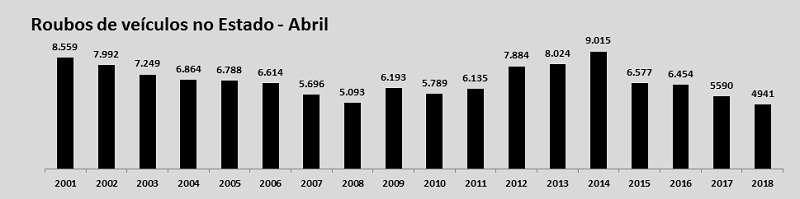 Em abril, os roubos em geral diminuíram 10,7%, com 2.734 ocorrências a menos (de 25.518 para 22.784). Já os roubos de veículos caíram 11,6% no quarto mês deste ano, passando de 5.590 para 4.941. É a primeira vez que o indicador fica abaixo de 5 mil ocorrências em um mês de abril.