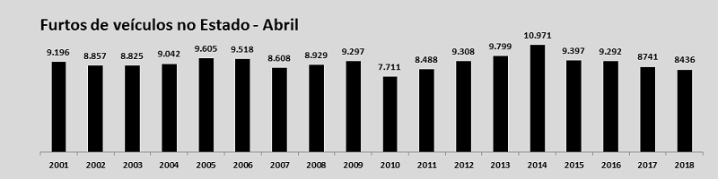 Os furtos em geral aumentaram em 1,6% no mês, com 662 boletins de ocorrência contabilizados a mais do que em abril de 2017. Os furtos de veículos reduziram em 3,5% no comparativo mensal. O total, que é o segundo menor número da série, caiu de 8.741 para 8.436 ocorrências registradas.