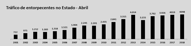 Em abril, o trabalho das polícias Civil e Militar resultou na realização de 15.838 prisões – 2,96% a mais comparando com o abril de 2017. O total é o segundo maior da série histórica, atrás de 2016 (16.088 casos).