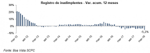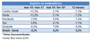 A inadimplência do consumidor caiu 5,2% no acumulado 12 meses (abril de 2016 até março de 2018 frente aos 12 meses antecedentes), de acordo com dados nacionais da Boa Vista SCPC. Já na avaliação mensal com ajuste sazonal, março apresentou aumento de 6,2%. Quando comparado o resultado contra o mesmo mês de 2017, o indicador caiu 6,3%.