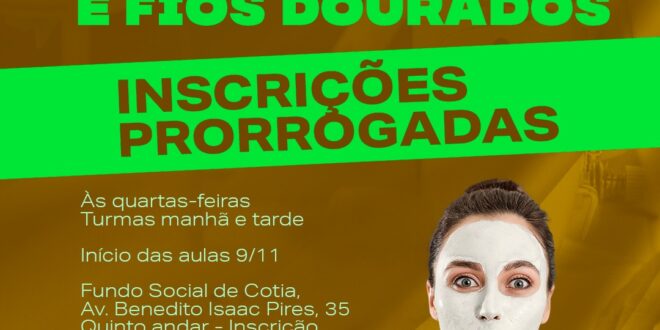 O Fundo Social de Cotia estendeu o prazo de inscrição para as últimas vagas disponíveis para os cursos gratuitos de argiloterapia e fios dourados e de reflexologia. As aulas começam este mês no Fundo Social (Avenida Benedito Isaac Pires, 35 – 4º andar), mesmo endereço para se fazer a inscrição. As interessadas devem apresentar RG, CPF e comprovante de endereço de Cotia.