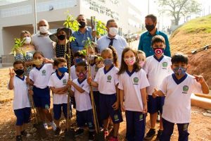 Uma das ações, foi realizada na manhã de hoje, com a escolha de alguns alunos da rede municipal de ensino, que realizaram o plantio de 11 árvores, que ficarão em destaque no local onde está sendo finalizada a construção da nova sede da Prefeitura de Jandira.