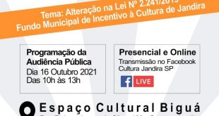 A Audiência Pública que tratará sobre alterações na Lei Municipal N° 2241/2019, será em formato presencial e online, agendada para o dia 16 de outubro, das 10h às 13h, no Espaço Cultural Biguá. Foto: Divulgação Acontece neste sábado, dia 16, a Audiência Pública de Cultura de Jandira, sobre propostas de …