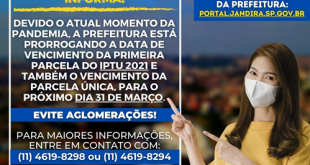 Em face ao número de munícipes que estão comparecendo presencialmente na prefeitura, para retirar seus carnês do IPTU. A Prefeitura de Jandira, reforça que, devido à crise da pandemia do COVID-19, o pagamento da parcela única e da primeira parcela do IPTU 2021, foram prorrogados e poderão ser realizados até …