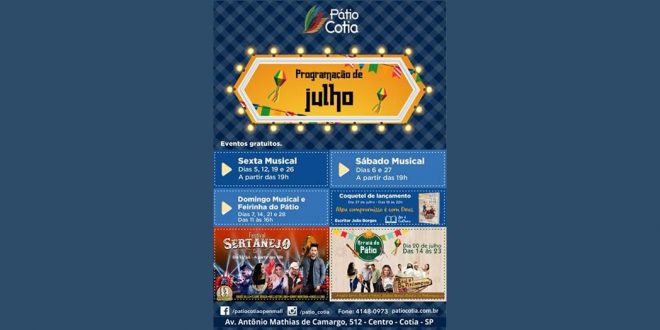 - Arraiá do Pátio – Sábado, dia 20 – Das 14 às 23h – Barracas típicas, Quadrilha associação Rejuvenescer, apresentação Cia Baru, shows ao vivo com Angela Lima, Ruan e Fábio, Elaine Braga, Rau e os Pirilampos.