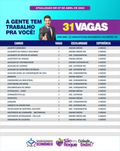 A Prefeitura de São Roque disponibiliza nesta quinta-feira, dia 7 de abril, as vagas de emprego cadastradas no Posto de Atendimento ao Trabalhador (PAT) Municipal. São diversas oportunidades de trabalho, com destaque para as novas vagas para agente funerário, auxiliar de escritório, motorista de caminhão, operador de pá carregadeira, dentre outras.