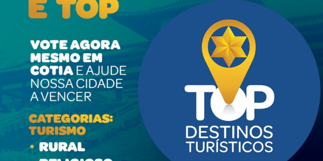 Segue até sexta-feira (26/05) o prazo de votação popular no Prêmio Top Destinos Turísticos. Cotia está no páreo da premiação em três categorias: turismo religioso, turismo rural e turismo gastronômico. Para votar em Cotia basta acessar o site https://votetop.com.br/voteagora. Qualquer pessoa pode registrar o seu voto, mas é preciso validar o acesso por meio do link social (perfil do Facebook ou e-mail Gmail), abrir as categorias e escolher Cotia. Cada perfil poderá registrar apenas um voto por categoria.