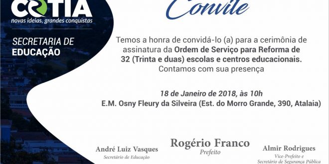 Às 10h, desta quinta-feira (18/01), o prefeito de Cotia, Rogério Franco, assina a ordem de serviço para início da reforma completa de 32 escolas municipais. A assinatura será na Escola Municipal Prof. Dr. Osny Fleury da Silveira, no bairro Atalaia. Em 2017, dezenas de unidades escolares já passaram por reformas e melhorias emergenciais para garantir um bom ambiente para professores, alunos e demais funcionários.