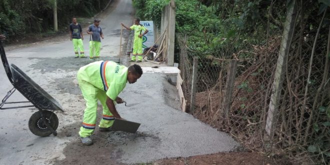 A prefeitura também precisou construir um muro no trecho desbarrancado para conter às margens da via, além de sustentar a base do pavimento que foi reposta. O trabalho foi concluído com a aplicação do calçamento de concreto.