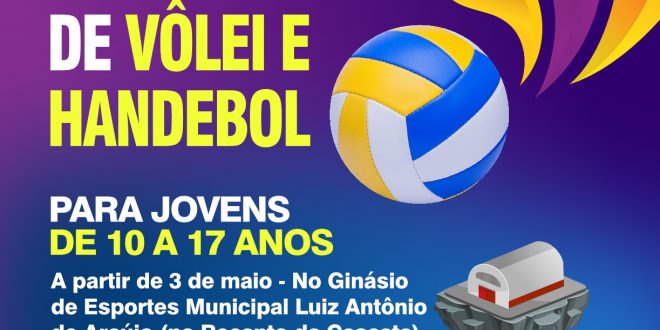 A Prefeitura inicia na próxima semana, dia 3 de maio, duas novas escolinhas esportivas na cidade, com aulas de Handebol e Vôlei aos jovens moradores da cidade. As aulas acontecerão duas vezes por semana para cada modalidade, sempre no Ginásio de Esportes Municipal Luiz Antônio de Araújo (localizado no Recanto da Cascata) e serão direcionadas para meninos e meninas de 10 a 17 anos.