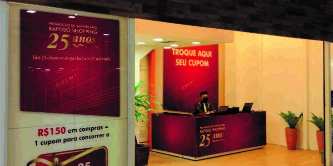 Em comemoração ao seu aniversário de 25 anos, o Raposo Shopping vai sortear 25 vales-compra no valor de R$ 1 mil cada. A cada R$ 150 em compras nas lojas do Shopping participantes da promoção, até o dia 20 de junho, o cliente pode participar dos sorteios. Para participar, basta trocar os cupons fiscais pelo cupom da promoção na loja de troca, que fica no piso Raposo.