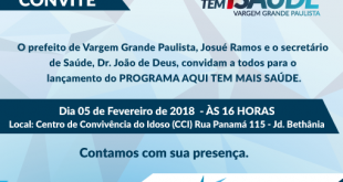 Na próxima segunda-feira (05/02), o prefeito de Vargem Grande Paulista Josué Ramos e o secretário de Saúde Dr. João de Deus, apresentarão oficialmente o Programa Municipal Aqui Tem Mais Saúde. Toda população está convidada a participar e conhecer a novidade, que será apresentada às 16 horas, no Centro de Convivência …